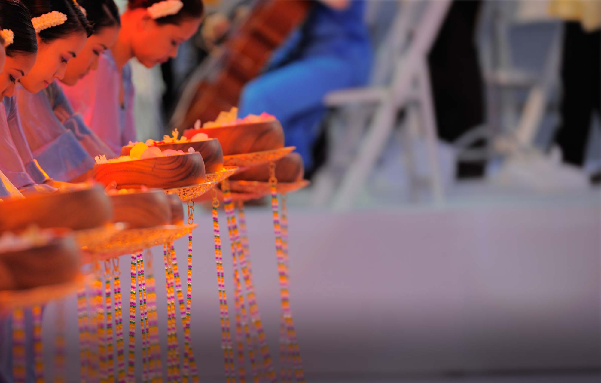 The ceremony starts with the opening of the iconic Hawaiian shell trumpet, or kani pū, followed by Japanese taiko, the ceremony then involves a chant, or oli, which calls in six large Parent Lanterns offering prayers and gratitude. And so on, this wave pattern continues.